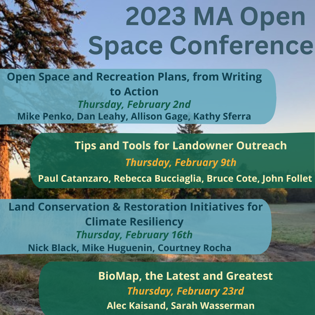 The Landscape Partnership grant program aims to protect larger areas of conservation land. Towns with less than 6,000 residents may also use this grant to build a park or playground. Applications must be jointly submitted by at least two of the following groups: municipality, non-municipal public water supplier, 501(c)(3) non-profit, government agency. For more information: https://www.mass.gov/service-details/landscape-partnership-grant-program